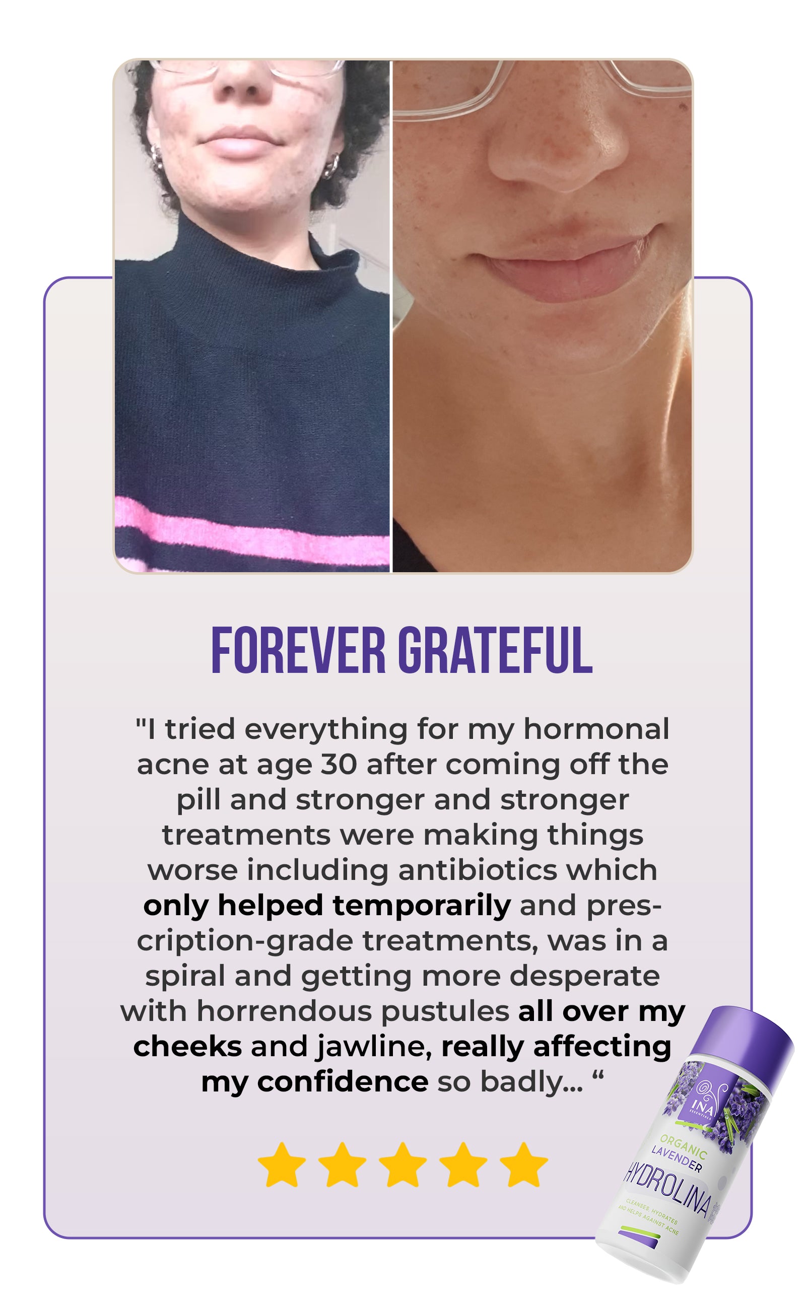 I'm 15 years old and I've been trying to get rid of my ance for so long.Ive tried so many products and nothing really made a difference until this lavender water and there lavender blueberry soap.My skin isn't fully clear but it's really cleared my skin up! I couldn't express how much I recommend this product as well as the lavender-blueberry soap.
